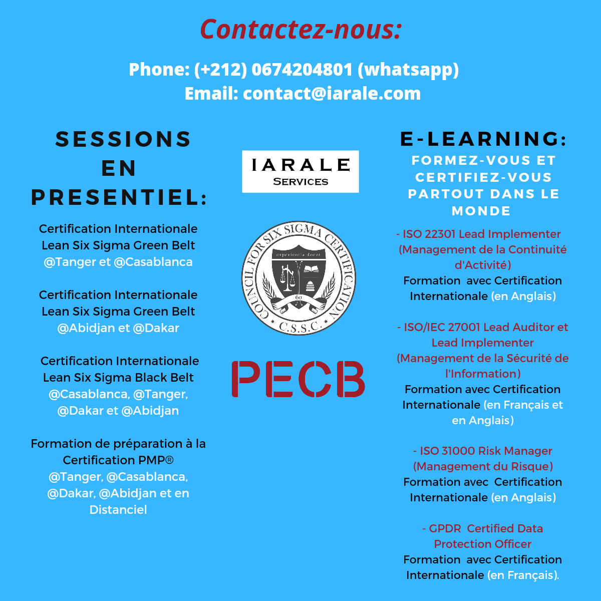 Pour plus d’informations ou pour s’inscrire à une session, contactez-nous au Tél: +212674204801 ou par Email: contact@iarale.com